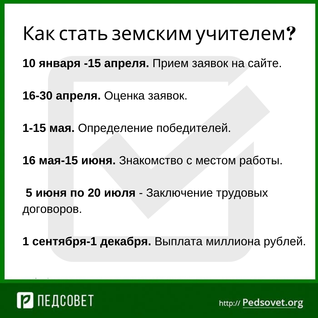 C 10 января по 15 апреля на сайте, который пока еще не открыт, будут приниматься заявки на вакансии в сельских школах. Все, кто откликнется и пройдет отбор, получат один миллион, а на Дальнем Востоке - два миллиона рублей.