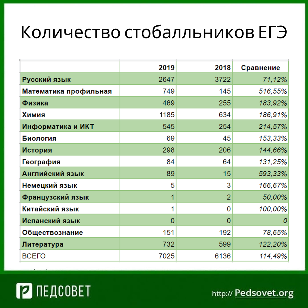 Больше всего заметно увеличение - по английскому языку и профильной математике. Правда, по математике максимальное количество баллов не сто, а пять. В ЕГЭ-2019 отличились два ученика, которые набрали максиальные сто баллов по всем четырем сдаваемым предметам.