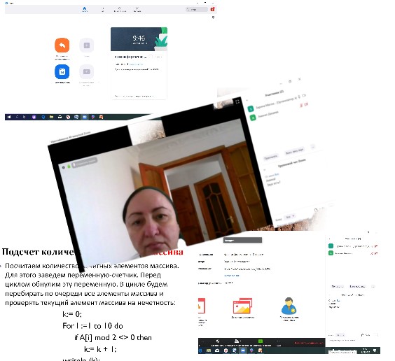 11.04.2020Дистанционный урок информатики в 10-ых классах МБОУ "Гимназия №2" провела учитель информатики МБОУ "Гимназия №2" г.Грозного Магомадова З.С. по теме: "Массивы". Урок проведен на платформе ZOOM с использованием образовательной платформы "Решу ЕГЭ", для демонстрации теоретического материала была использована презентация.