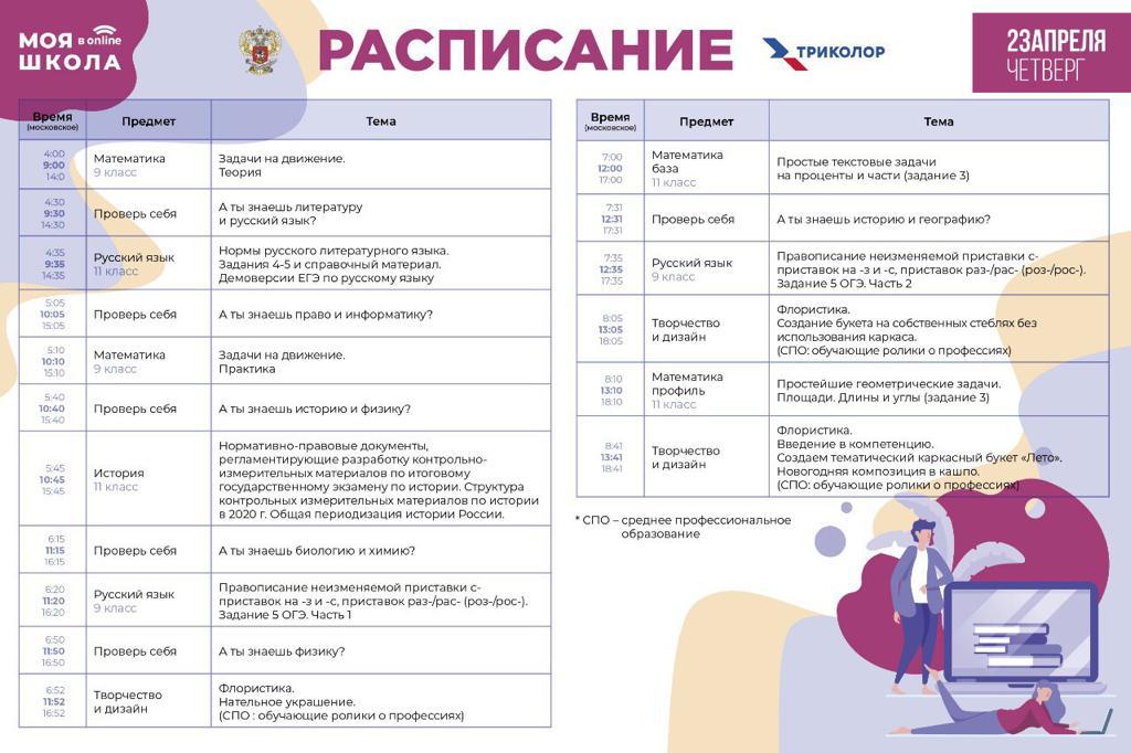 23.04.2020Друзья! Публикуем расписание второго дня трансляции нового телевизионного образовательного проекта Минпросвещения России «МОЯ ШКОЛА в online».