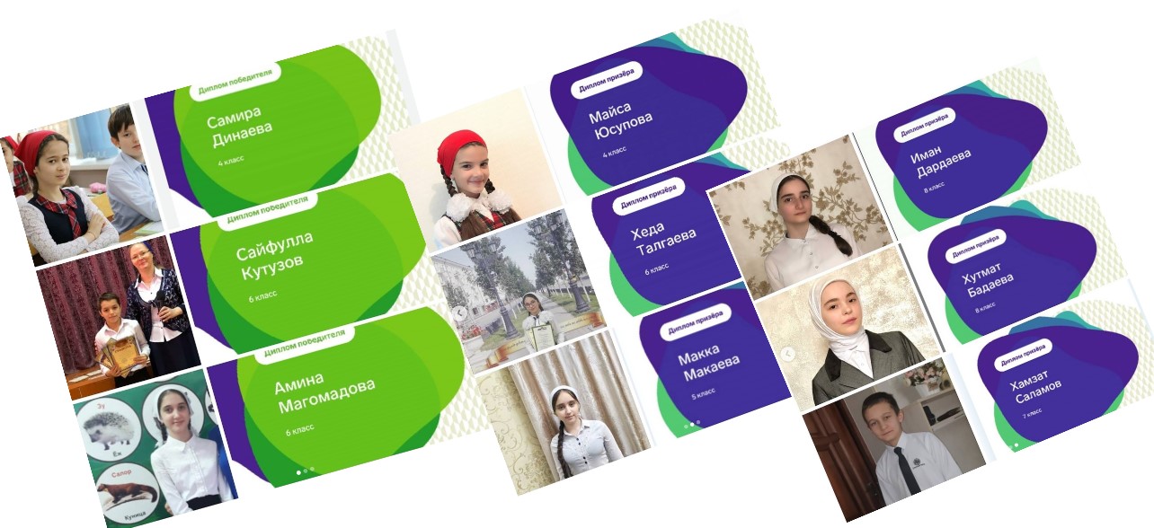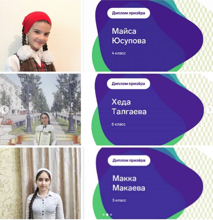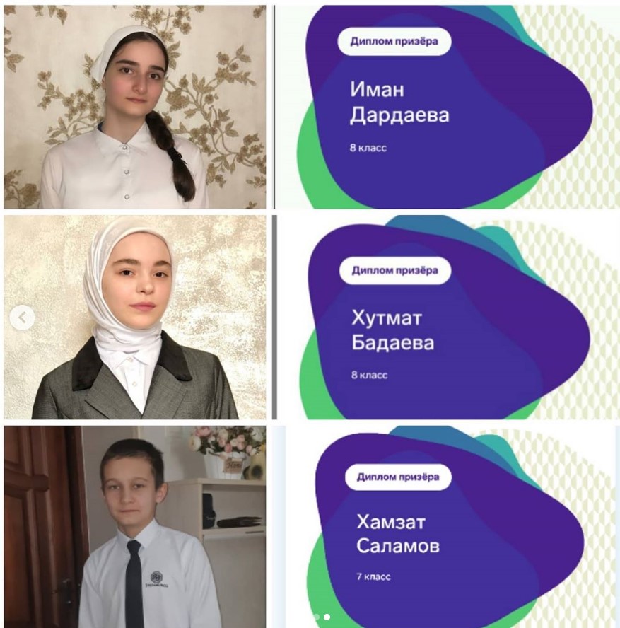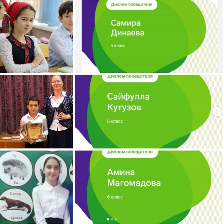 Ученица 4 класса Динаева Самира стала победительницей олимпиады по математике, учащиеся 6 класса Кутузов Сайфулла и Магомадова Амина - победителями олимпиады по биологии. Призерами олимпиады по математике стали Юсупова Майса (4 класс), Макаева Макка (5 класс), Талгаева Хеда (6 класс), Дардаева Иман (8 класс), по биологии - Талгаева Хеда (6 класс), Саламов Хамзат (7 класс), по химии - Бадаева Хутмат (8 класс). Победители и призёры награждены Дипломами. В онлайн-туре олимпиады, который проходил с 20 апреля по 26 мая, участвовало более 30 учащихся гимназии по шести дисциплинам, приоритетным согласно Стратегии научно-технического развития страны: математике, информатике, физике, химии, биологии и астрономии. Желаем новый побед!