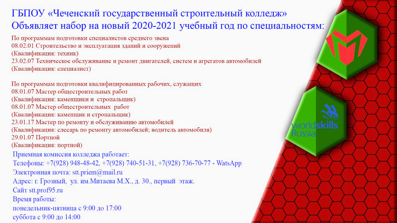ГБПОУ «ЧЕЧЕНСКИЙ ГОСУДАРСТВЕННЫЙ СТРОИТЕЛЬНЫЙ КОЛЛЕДЖ» ОБЪЯВЛЯЕТ НАБОР НА НОВЫЙ 2020-2021 УЧЕБНЫЙ ГОД