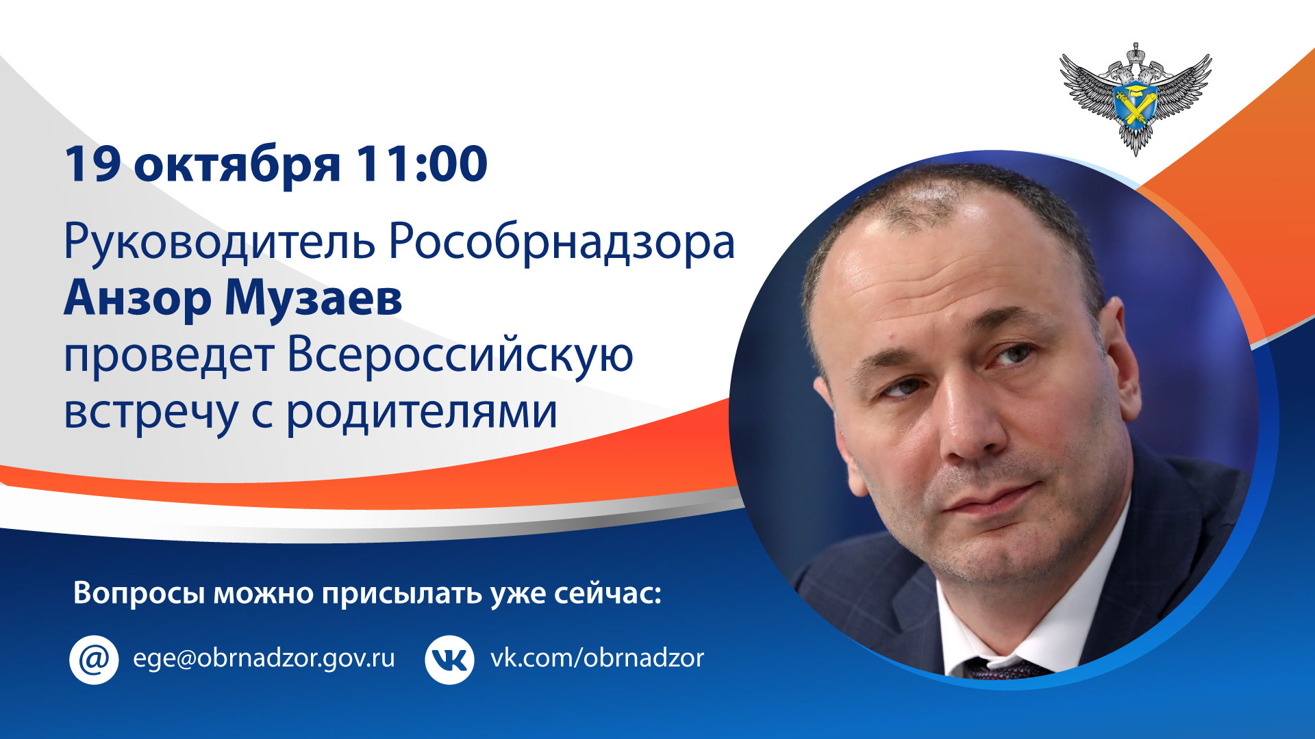 Всероссийская встреча с родителями руководителя Федеральной службы по надзору в сфере образования и науки Анзора Музаева пройдет 19 октября 2020 года в 11:00 мск.