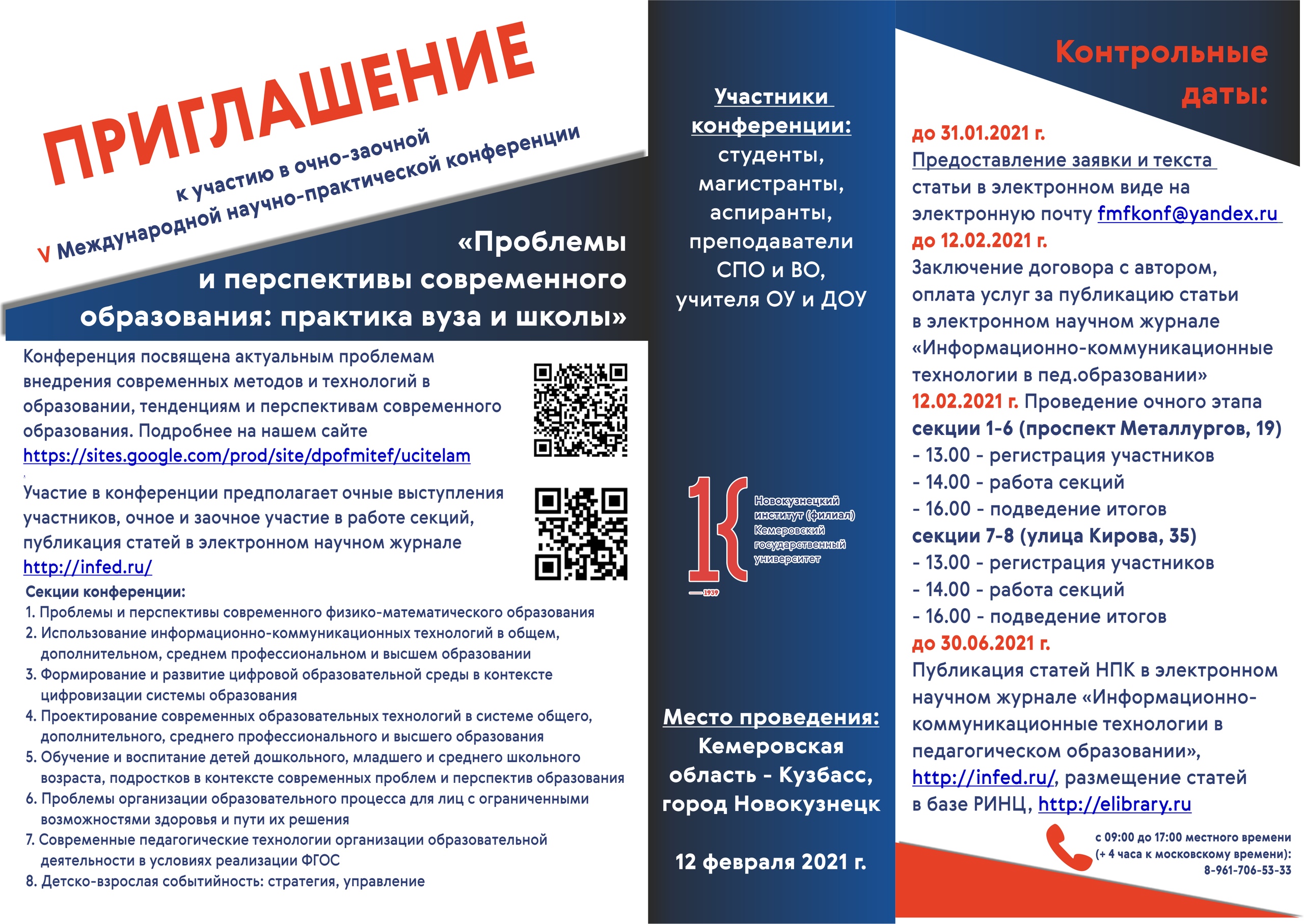 Приглашаем Вас принять участие в V Международной очно-заочной научно-практической конференции«Проблемы и перспективы современного образования: практика вуза и школы»город Новокузнецк, 12 февраля 2021 г.