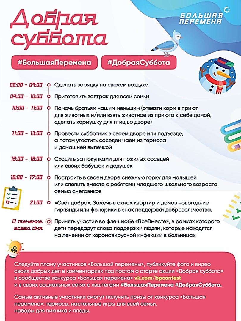 22.01.202122 января 2021 года в сообществе Всероссийского конкурса для школьников «Большая перемена» социальной сети ВКонтакте (https://vk.com/bpcontest) стартует Всероссийская акция «Добрая суббота».