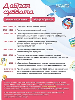 Акция «Добрая суббота» пройдет впервые 23 января 2021 года и предоставит возможности для самореализации ребят в среде волонтерства и социального проектирования. Акция станет традиционной и будет проводиться еженедельно в сообществе конкурса «Большая перемена».