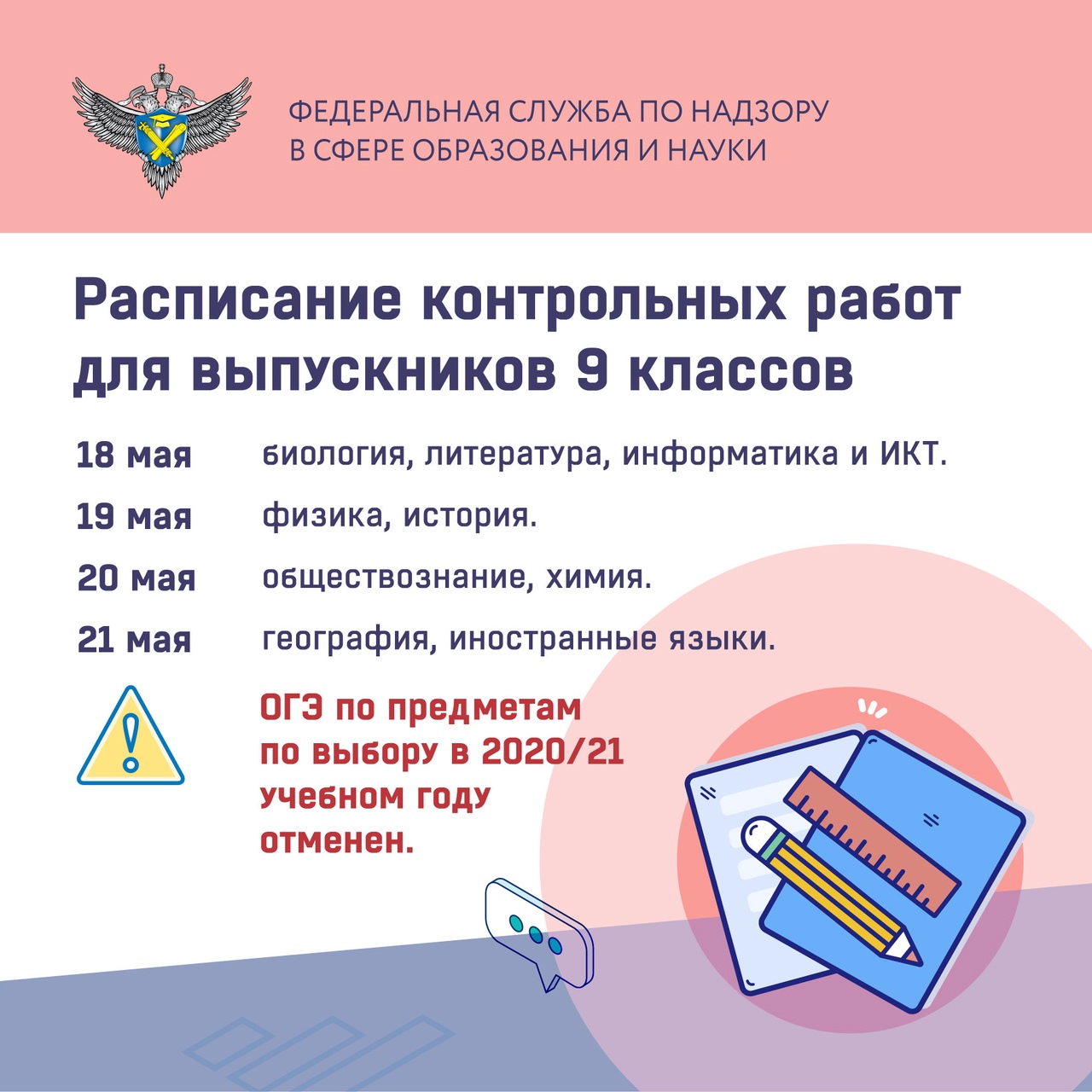 29.03.2021В Рособрнадзоре назвали даты проведения контрольных работ для 9-х классов, которые школьники будут сдавать вместо ОГЭ.