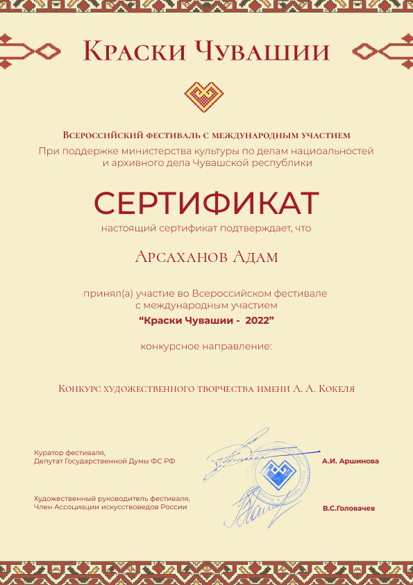 Ученик 6 "Д" класса,МБОУ «Гимназия №2» г.Грозного Арсаханов Адам принял участие во Всероссийском фестивале с международным участием «Краски Чувашии - 2022»