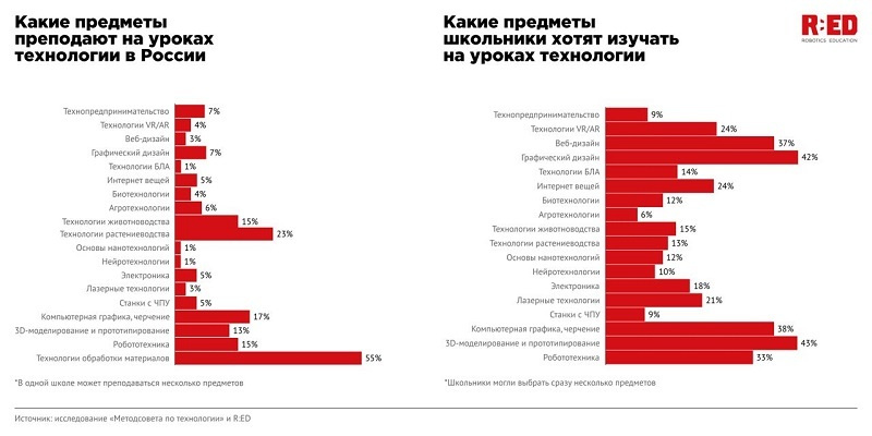 24.06.2022Российские школьники хотели бы получать на уроках технологии совершенно не те навыки, которым обучают сейчас в большинство школ. Таковы результаты исследования, которое провели Национальный методический совет по технологии и производитель робототехнических конструкторов для школ R: ED (есть в распоряжении Педсовета). Так, большинство опрошенных школьников сказали, что хотели бы обучаться 3D-моделированию, компьютерной графике и веб-дизайну. На практике же большинство респондентов на уроках технологии учится сверлить, строгать, резать и пилить. Четверть (23%) рассказали, что их учат растениеводству, и только 17% изучает компьютерную графику и черчение. Любопытно гендерное распределение интересов: если девочки чаще отдают предпочтение графическому и веб-дизайну, то мальчики больше интересуются 3D-моделированием и робототехникой.