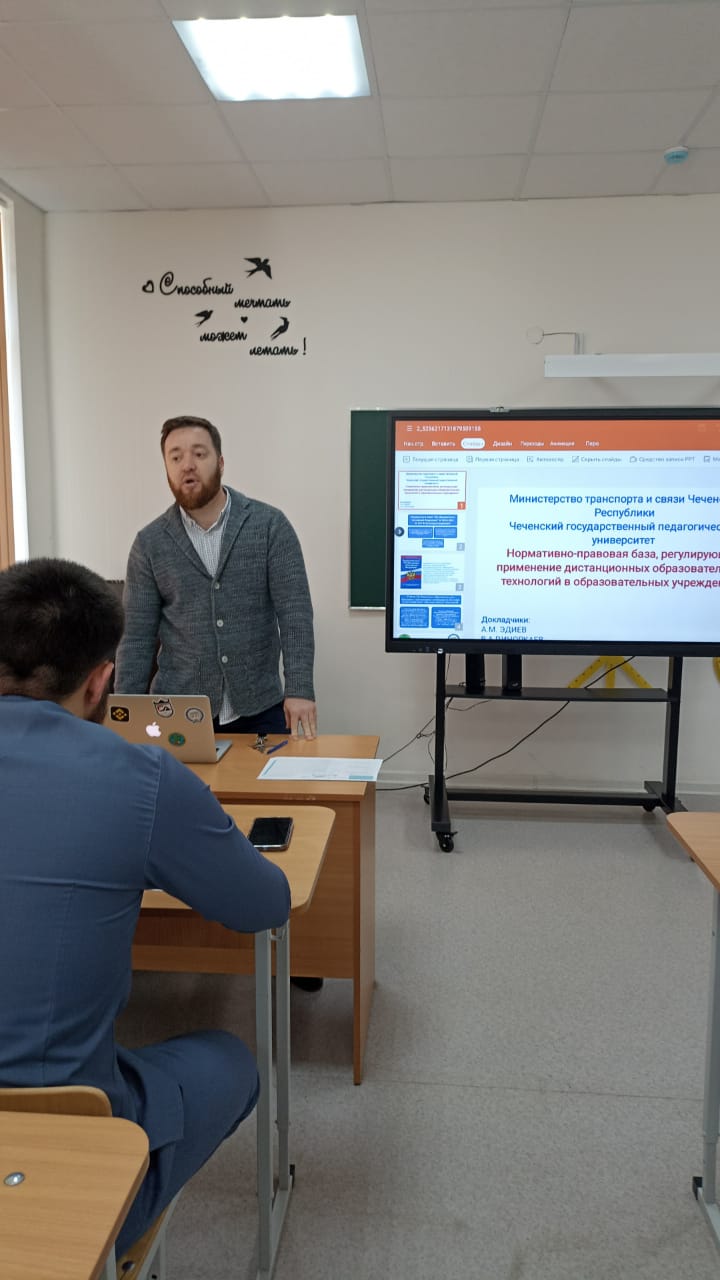 25.03.2023В рамках года педагога и наставника 25 марта 2023 года в МБОУ «Гимназия №2» г. Грозного состоялся семинар для заместителей директоров по ИКТ. Семинар открыл директор МБОУ «Гимназия №2» Шишханова Л.Д. На семинаре с докладом «Нормативно-правовая база, регулирующая цифровой контент для образовательного процесса» выступили представители Министерства транспорта и связи: Эдиев Алихан Магомедович, заместитель министра транспорта и связи ЧР и Иноркаев Вахид Абу-Рашидович, начальник отдела связи и информатизации Министерства транспорта и связи ЧР.