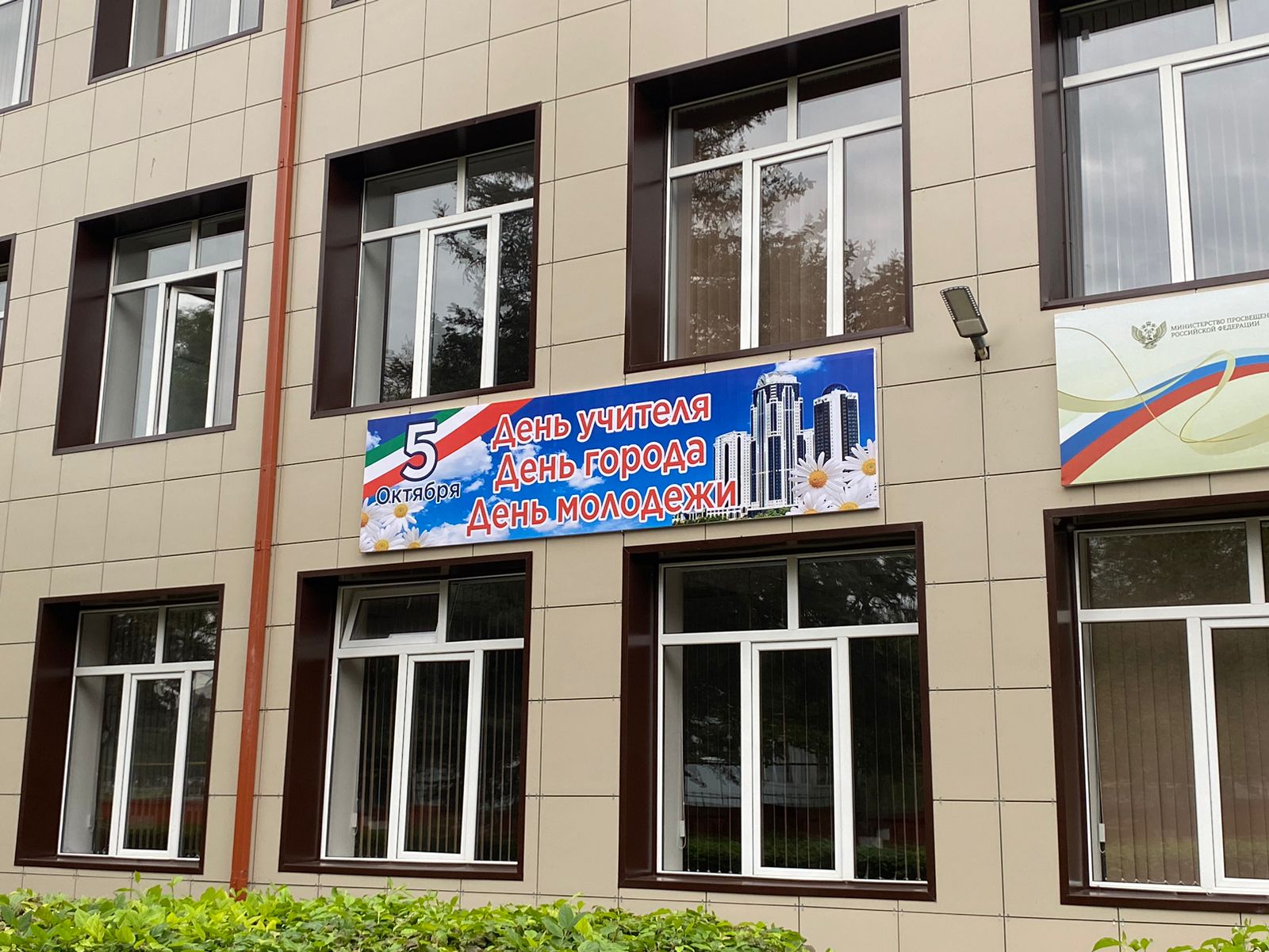 В преддверии Дня учителя баннером оформлен фасад гимназии