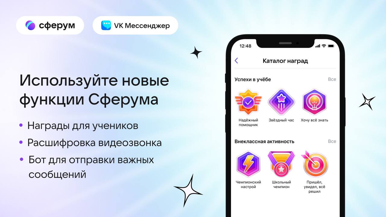 12.01.2024Сферум представил новые функции для педагогов, родителей и учащихся. В учебном профиле Сферум в VK Мессенджере появился раздел «Награды», благодаря которому педагоги смогут мотивировать и поощрять школьников за достижения в учебе, спорте и внеучебной деятельности. Пользователям Сферума стала доступна расшифровка видеозвонков, с помощью которой можно оперативно получать текстовые расшифровки педагогических совещаний или родительских собраний. В последнюю версию разработчики также добавили функцию важных сообщений — она поможет не пропустить в учебной переписке нужную и актуальную информацию. НАГРАДЫ ЗА ДОСТИЖЕНИЯ Учителя с верифицированным учебным профилем Сферума в VK Мессенджере могут выдавать награды школьникам прямо в чате класса или личной переписке. Награды будут видны в учебных профилях детей. Награду «Звездный час» можно получить за отличный доклад, «Хочу все знать» — за активную работу на уроке, а «Надежным помощником» может стать тот ученик, который выручил одноклассников. Предусмотрены также специальные знаки отличия для победителей городской олимпиады — «Пришел, увидел, все решил» и обладателей спортивных достижений — «Чемпионский настрой» и «Школьный чемпион» — за активность на уроке физкультуры или победу на спортивном соревновании от лица школы. На старте в Сферуме доступно шесть наград. Каждую ученик может получить один раз, но она навсегда останется в его учебном профиле и будет видна всем пользователям. РАСШИФРОВКА ВИДЕОЗВОНКОВ И ФУНКЦИЯ ВАЖНЫХ СООБЩЕНИЙ Пользователи учебного профиля Сферум в VK Мессенджере могут воспользоваться функцией расшифровки видеозвонков — она будет полезна, если нужно получить протокол педагогического совещания или родительского собрания в текстовом формате. После начала звонка необходимо нажать кнопку расшифровки, а по его окончании файл с текстом придет в чат. Функция важных сообщений позволяет оповестить всех участников чата о сообщении и следить, чтобы все с ним ознакомились. Например, это может быть оповещение о дате проведения родительского собрания или итоговой контрольной. Чтобы воспользоваться этой функцией, необходимо в поле для сообщения в чате ввести три восклицательных знака, затем перейти на новую строку, нажав Shift + Enter, и написать текст. После этого придет уведомление от сообщества «Сферум на связи», которому нужно подтвердить отправку сообщения. «Цифровые инструменты помогают педагогам в организации учебного процесса и снимают с них часть рутинных задач. Функция важных сообщений позволяет не упустить самое необходимое в объемной переписке, а возможность расшифровки видеозвонка — получить текстовый протокол онлайн-совещания или родительского собрания. Кроме того, учеников можно мотивировать не только высокими оценками, но и специальными наградами прямо в Сферуме», — рассказал Рубен Акопов, руководитель сервиса Сферум, VK. Напомним, что учебный профиль Сферум в VK Мессенджере – российский информационно-коммуникационный сервис, предназначенный для образовательных целей и общения учителей, школьников и родителей в едином и защищенном образовательном пространстве. Учебный профиль Сферум является дополнительным цифровым инструментом, который помогает сделать традиционное образование в классе более эффективным и современным, 