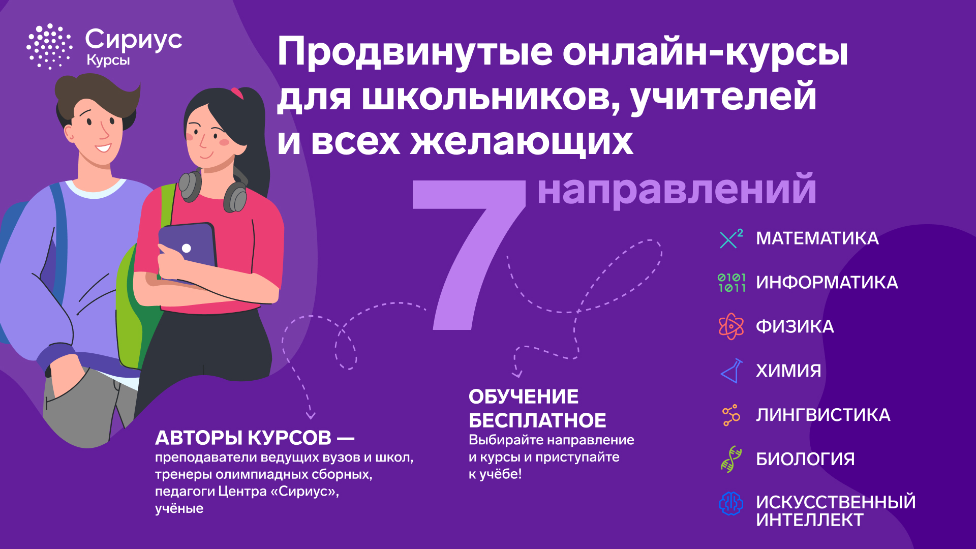 Продвинутые курсы для школьников, учителей и всех желающих. Если вы уверенно знаете школьную программу и хотите изучать предметы углублённо — присоединяйтесь к Сириус.