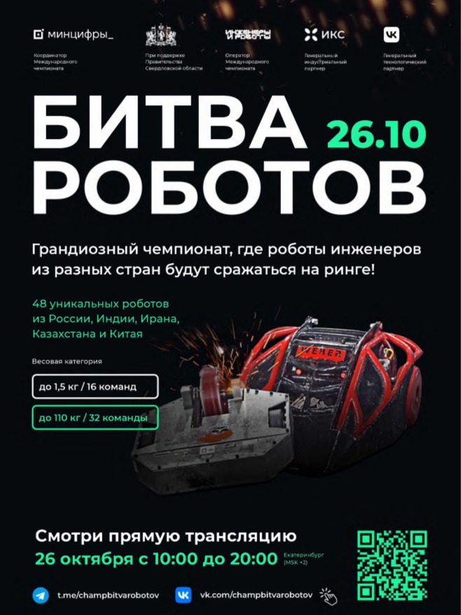 30.10.2024Минцифры России в соответствии с распоряжением Правительства Российской Федерации от 11 апреля 2023 г. № 889-р сообщает о проведении второго отборочного этапа Международного чемпионата по битве роботов , который способствует продвижению инженерной мысли как драйвера развития и поддержки современных цифровых технологий. Второй отборочный этап Чемпионата состоится 26 октября 2024 г. при поддержке Правительства Свердловской области на территории международного выставочного центра «Екатеринбург-Экспо» (павильон № 4) по адресу: г. Екатеринбург, бульвар ЭКСПО-бульвар,