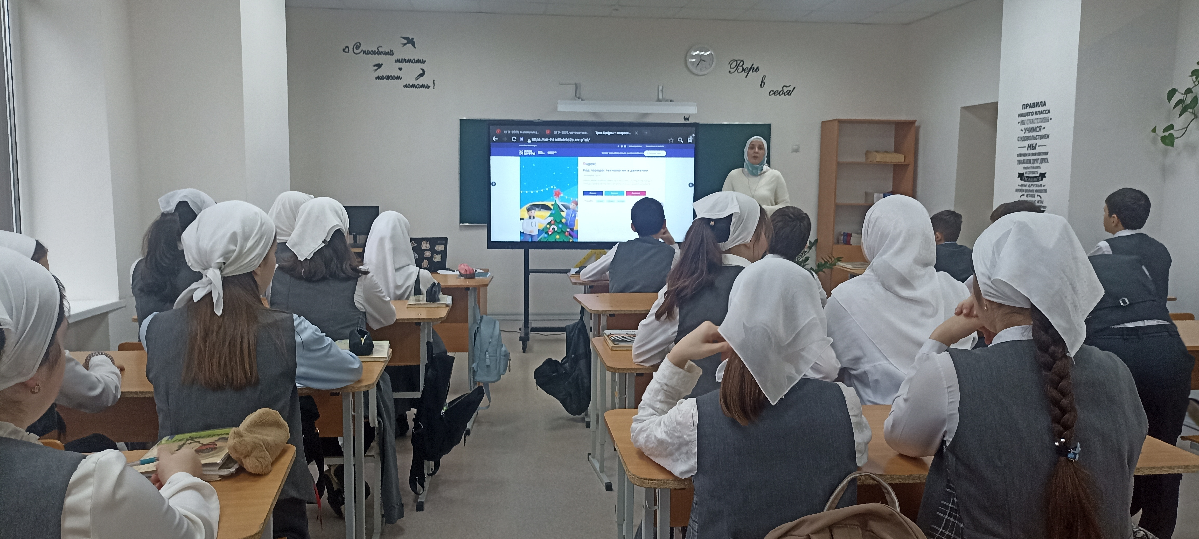 В завершении занятия ребята выполнили задания интерактивного тренажера на сайте проекта. Работая в группах за компьютерами, им удалось справиться со всеми предложенными заданиями, хотя некоторые из них оказались довольно сложными. «Урок был очень познавательным и интересным! Надеемся, что полученные знания помогут нашим обучающимся лучше понимать, как устроены современные города и как технологии делают нашу жизнь более комфортной и безопасной», – поделились впечатлением об уроке педагоги школы.