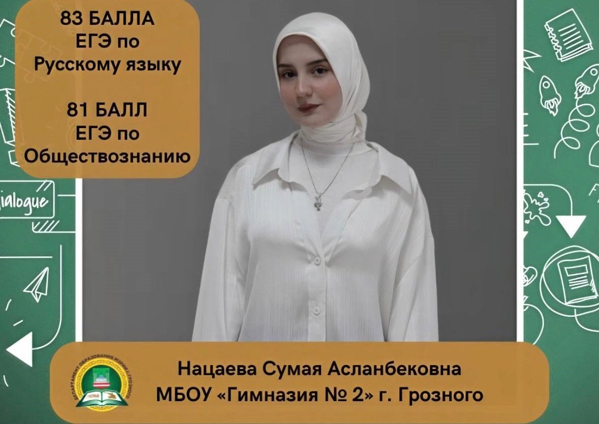 18.09.2025Нацаева Сумая Асланбековна, ученица МБОУ «Гимназия № 2» г. Грозного, набрала на ЕГЭ 83 балла по русскому языку и 81 балл по обществознанию.