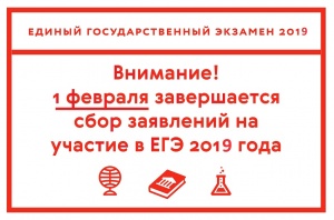 22.01.2019Федеральная служба по надзору в сфере образования и науки напоминает, что заявления на участие в ЕГЭ-2019 принимаются до 1 февраля включительно.