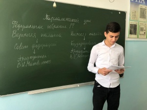 Сегодня в 11а классе учителем обществознания Бакаевым Ш.И. проведен традиционный урок парламентаризма на основе разработанных и подготовленных для проведения Единого урока материала.