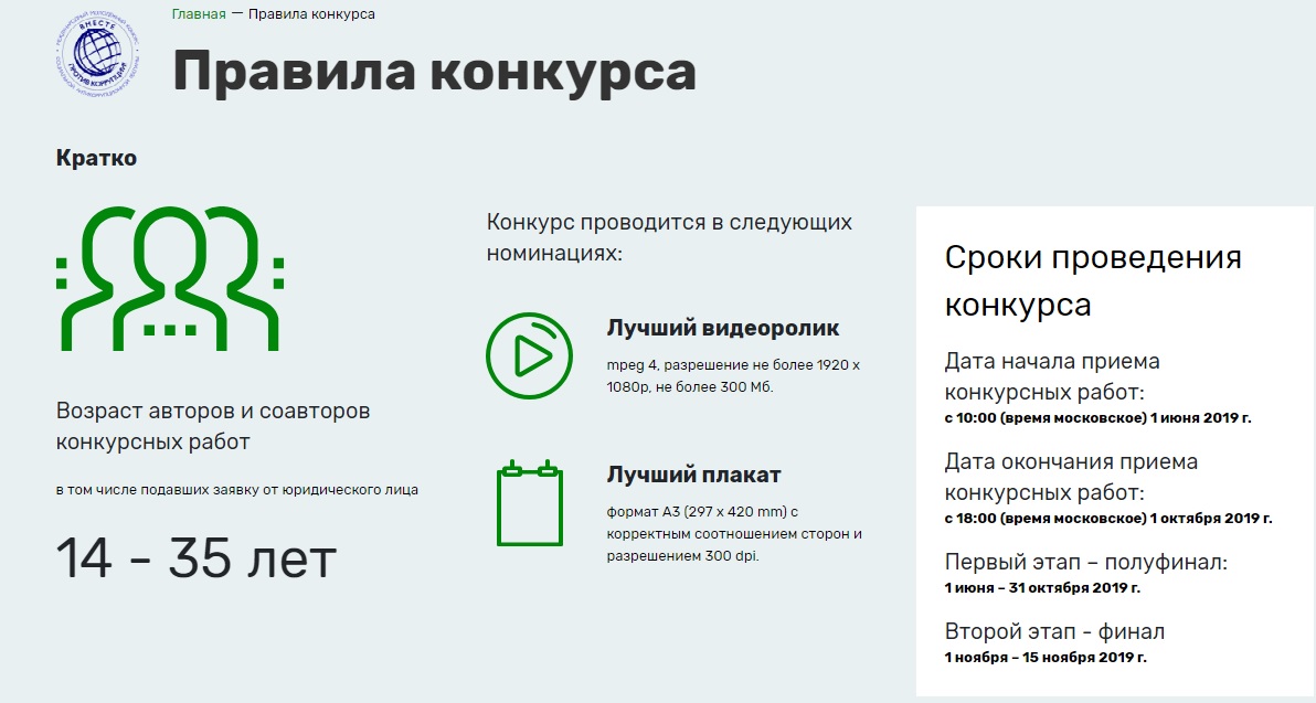 Конкурс проводится для молодежи из Российской Федерации, а также других государств — участников Межгосударственного совета по противодействию коррупции (Армения, Беларусь, Казахстан, Кыргызстан, Таджикистан) и стран БРИКС (Бразилия, Индия, Китай, ЮАР).Соорганизаторами этого мероприятия являются компетентные в сфере противодействия коррупции органы государств — участников конкурса.К участию приглашаются молодые люди в возрасте от 14 до 35 лет из Армении, Беларуси, Бразилии, Индии, Казахстана, Китая, Кыргызстана, России, Таджикистана и ЮАР, которым предлагается подготовить антикоррупционные плакаты и видеоролики на тему «Вместе против коррупции!». Подробнее по ссылке: http://www.anticorruption.life/rules/