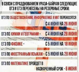 04.06.2019РОСОБРНАДЗОР В СВЯЗИ С ПРАЗДНОВАНИЕМ ПРАЗДНИКА УРАЗА-БАЙРАМ, ДАЛ ПРАВО ПЕРЕНЕСТИ ЭКЗАМЕНЫ, ВЫПАДАЮЩИЕ НА 4-6 ИЮНЯ, НА РЕЗЕРВНЫЕ СРОКИ.