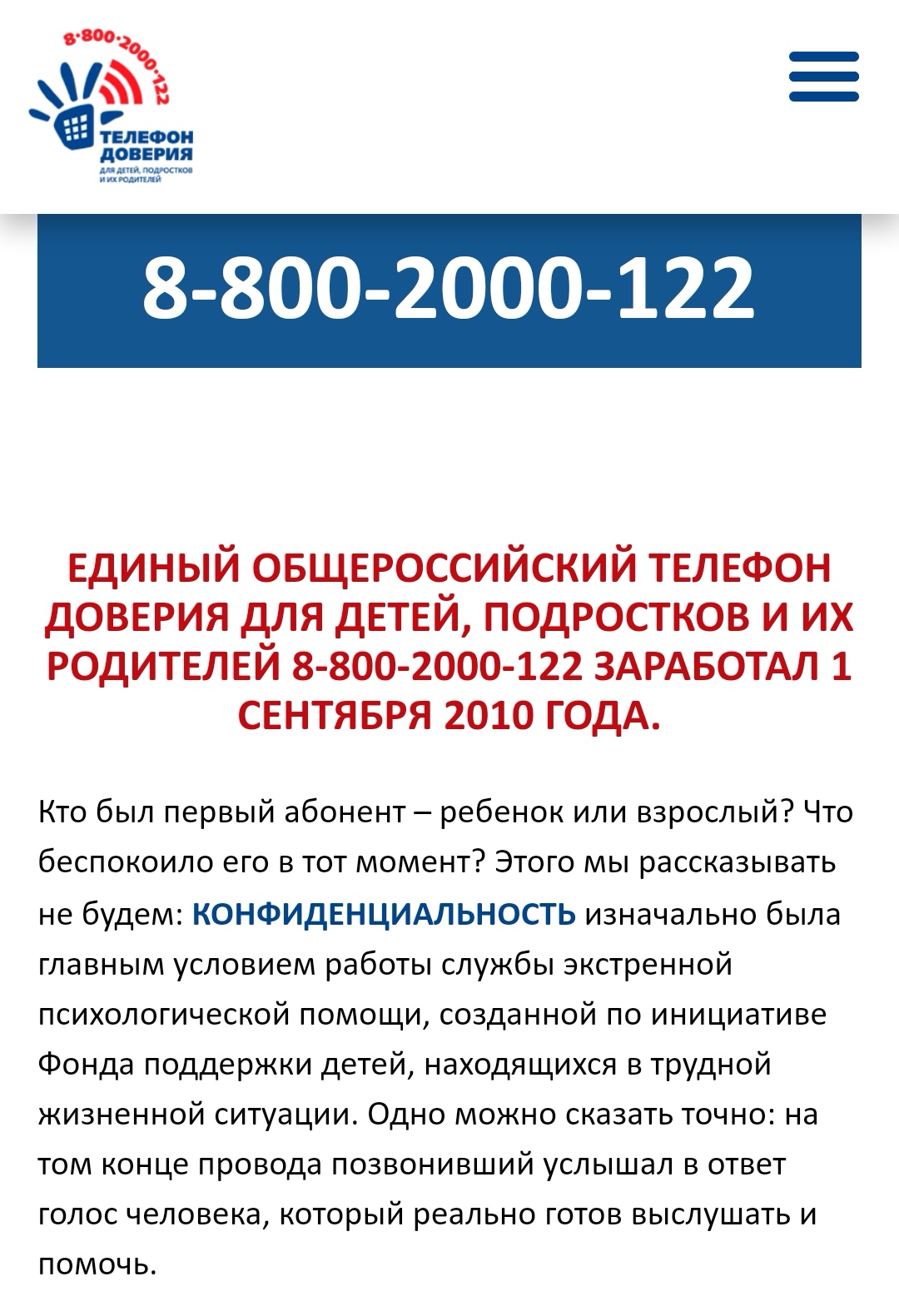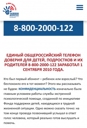Детский телефон доверия 8-800-2000-122 создан для оказания психологической помощи детям, подросткам и их родителям в трудных жизненных ситуациях.